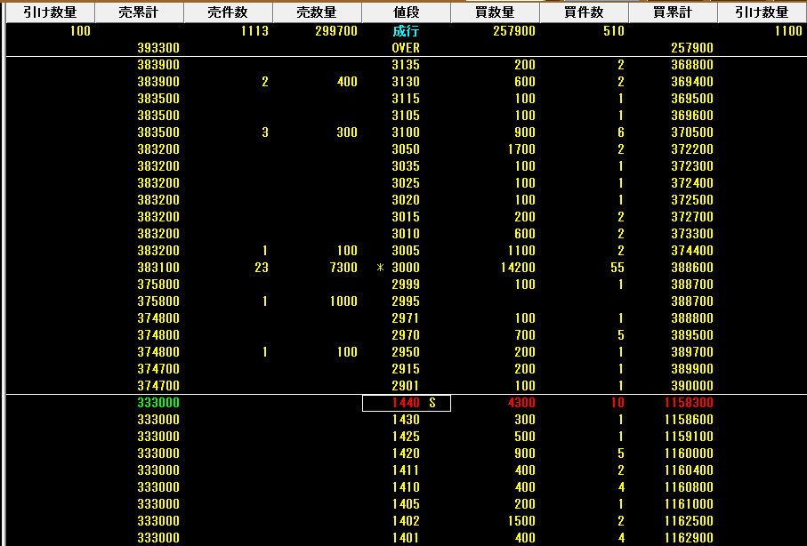 節目となる3000円に14200株の買い注文が入っています。 (*マークが売買合致点です)