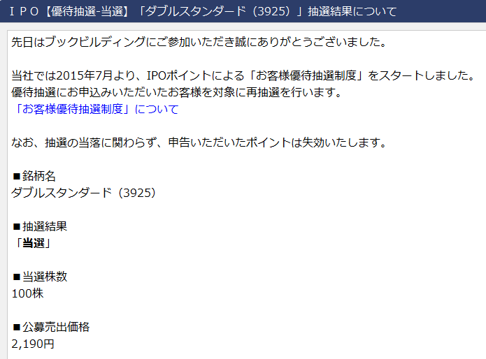 【当選!】 IPO ダブルスタンダード (3925) ~ 『裏』ポイント抽選で当選!