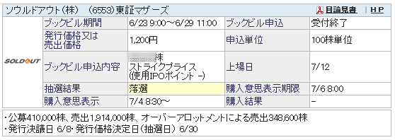 IPO当落結果「ソウルドアウト」無事に当選頂きました!!