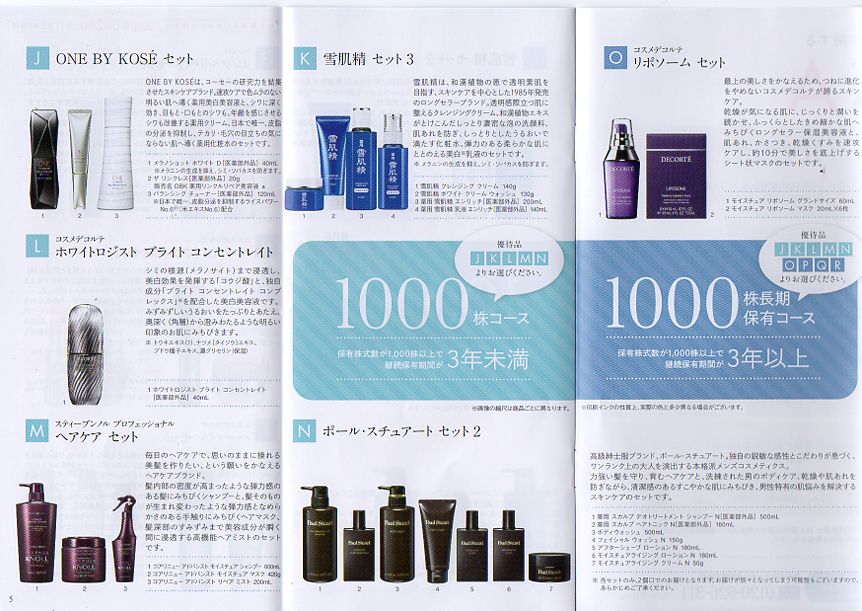 コーセー (4922)より優待案内が到着しました。クロス収得ですが、最低の100株優待でもワンショット140万円弱かかる値がさ優待になります。初収得で驚きましたが、「ジルスチュアート」があるのですね。万が一、20代女子とコネクションがあるかたがいれば有益な優待品になるのではないでしょうか(^_-)-☆ メンズ向けではポールスチュアートのシャンプーやボディソープのセットがあり、コーセーはけっこうメジャーなブランドをおさえています。